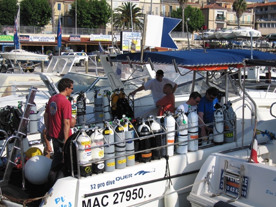 Thierry plongera avec Alix en circuit ouvert, en bi 15 avec trois gaz de déco. Les S80 contiennent du 22/30, du Nx 40 et du Nx 75. Le mélange fond est un Tx 12/60, ce qui pour la profondeur de 96 mètres donne une profondeur équivalente de 28 mètres : confortable !! Les trois autres plongeurs utilisent des circuit fermés, Inpiration Vision pour François Brun, rEvo pour Jérôme Mazier, plus connu sous le surnom de Captain, et moi-même. Le diluant du rEvo est, pour ne pas changer, de l’Héliox 10/90 alors que François préfère un Tx 12/65. Le rendez vous, après avoir changé plusieurs fois en raison des obligations des uns et des autres est fixé au lundi 11 juin 2007. Quelques jours avant le jour J chacun se connecte à la météo qui confirme que le temps est favorable. Nous partons de Grenoble dimanche soir avec le Grand Espace de Lionel, fidèle compagnon de nos virées sur la côte. Jérôme et Alix tenteront de dormir en vain, les plaisanteries fusent et la voiture n’est pas un dortoir. Nous mettrons trois heures pour rejoindre La Ciotat. Philippe a réservé des chambres à l’hôtel de la marine qui dispose d’un parking privé appréciable car notre voiture est super chargée. (http://www.cybevasion.fr/hotels/france/hotel_la-marine_la-ciotat_9329.html). L’hôtel est super calme et à deux pas du centre de plongée et du port. Après avoir pris nos quartiers nous mangerons en ville et irons rapidement nous coucher afin d’être en forme pour le lendemain. Le rendez vous est fixé à 8 heures au port.