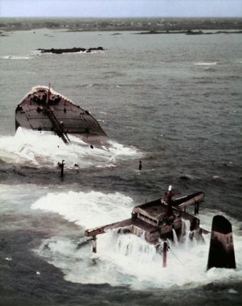 Le Capitaine Bardari ordonne alors de mouiller l'ancre bâbord tandis que le remorqueur essaie fébrilement de contenir l'infernale dérive pendant une heure. Quelques minutes plus tard, l'arrière talonne par 18 mètres de fond, ce qui provoque une voie d'eau à la machine et la perte de l'énergie électrique. A 21 h 40, l'arrière du pétrolier touche une nouvelle fois et cette fois, le pétrole commence à s'échapper. Jugeant sa situation désormais sans espoir, Bardari fait tirer des fusées rouges et vers 22 heures, l'Amoco Cadiz s'échoue définitivement sur le récif de Men Goulven, à un mille de la côte de Portsall vomissant des flots de pétrole par ses flancs crevés. Tous les efforts du Pacific ont été vains et l'une des plus grandes catastrophes écologiques de la planète est en marche.