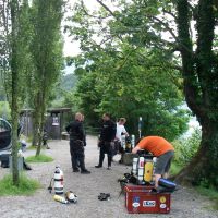 Notre palanquée sera mixte : Manu en ouvert (Tx 16/40, Nx 40/30 et 02), Alex en Megalodon (diluant Tx 10/50) et mézigue en rEvo (diluant Hx 10/90). Nous attaquons la descente pour notre check à 6 mètres. Ca tombe bien c'est la profondeur de la marche... Après une descente à 45°, la cassure est sévère : sous les pieds une falaise verticale, parfois en surplomb, descend jusqu'à environ 160 mètres... Mais nous ne descendrons aujourd'hui qu'à 80. Nous avançons ensuite à l'horizontal pour prendre la vraie mesure de ce site vraiment incroyable. Le froid se fait sentir et nous apprécions nos chauffages. Manu, en ouvert, nous quittera au bout de 17 minutes. Le noir est profond, la falaise nous renvoie, grâce à nos phares, la blancheur de la vase qui s'est parfois déposée sur de très légères aspérités... Il ne faut pas avoir de soucis d'équilibrage, sinon, c'est le grand saut !! Nous avons 80 mètres d'eau au dessus de nous et autant en dessous !! Nous descendons doucement jusqu'à 90 mètres. Les profondeurs plus abyssales seront pour une prochaine fois. Aujourd'hui c'est une prise de contact... et quel contact !!! Nous sortirons de l'eau au bout de 120 minutes après avoir quitté notre profondeur maximale après 30 minutes d'immersion. Nous échangerons nos impressions sur ce site pendant un long moment avant de reprendre la route, fort longue pour rejoindre nos pénates...
