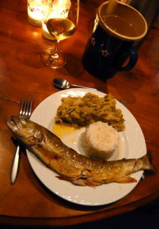 Omble Chevalier au beurre clarifié accompagné de riz et d''un fondu de poireaux