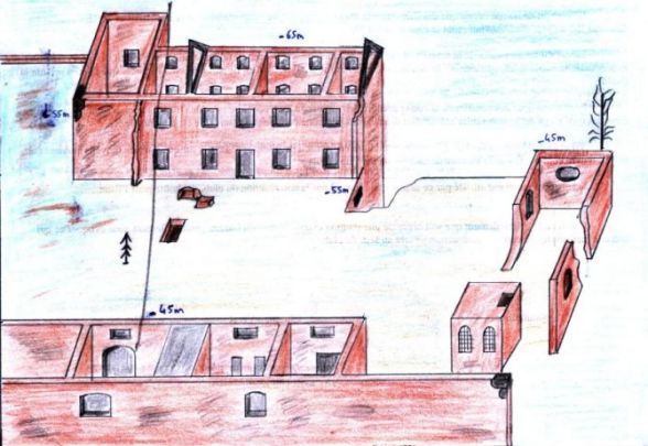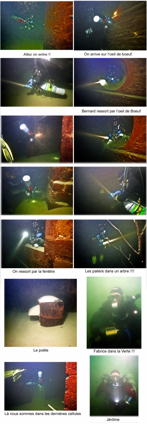Nous suivons un muret qui remonte en droite ligne pour nous conduire à un nouveau bâtiment. Il est facile d’imaginer les moines se promenant dans ces jardins en déambulant dans ses escaliers. Soudain dans le grand mur rouge, un trou se dessine, il s’agit d’un œil de bœuf. Bernard me demande d’attendre, il passe devant moi en repartant d’où nous venons et disparaît. Les secondes filent et sa lumière est de nouveau visible mais cette fois dans le trou. Nous faisons quelques images puis remontons le long du mur pour arriver sur une terrasse. Là les arbres sont toujours bien droits et nous commençons nos paliers au sommet de l’un deux : magique et complètement incongru. Nous avions décidé de rentrer à la berge afin de ne pas faire nos paliers en pleine eaux : la route est longue !!!