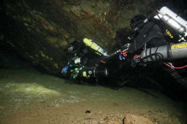 Nous étions venu début aôut avec Alex et Did pour une plongée Trimix afin qu'ils puissent voir le bas de la falaise à 64 mètres. La fin d'après midi était chaude et nous avions pas mal transpiré avant de nous mettre à l'eau. Cette grosse suée avait eu pour conséquence de limiter le temps fond du binôme "circuit ouvert" à 15 minutes avec un Tx 20/25. Pour ma part ayant une grosse foulure à la cheville gauche j'avais prévu le scooter (merci Philippe !!!). J'ai donc trainé au fond après les avoir quitté et proffiter des surplombs qu'offrent cette plongée. Le chauffage évite d'avoir froid malgré la transpiration et c'est très agréable !!!!