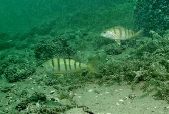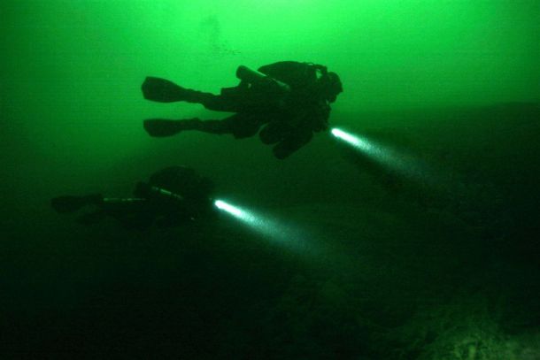 L'eau était vraiment super claire avec beaucoup de lottes. J'ai attaqué la remontée au bout de 35 minutes et après avoir passé une couche où j'avais du mal à lire mes instruments (entre 18 et 12 mètres), je me suis retrouvé dans une eau christaline où les brochets, perches, gardons et écrevises grouillaient litéralement sous la lumière de mon phare. Il commençait à faire nuit, la faune reprenait ces droits... En faisant surface au bout de 75 minutes je retrouve Alex et Didier, tous deux super contents de leur plongée !! Des plongeurs "club" de la région, toujours aussi équipés de façon "exotique" blocs mono sortie, détendeurs étrier, et j'en passe.... sont venus proffiter de cette belle plongée de nuit après un diner au restaurant du port.