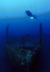 C'est la raison pour laquelle nous avions l'intention d'aller sous terre mais les conditions à BSA et à Fontaine de Vaucluse ne permettent pas de plonger. Pour des raisons de simplicité, c'est vers la rade de Marseille que nos espoirs se sont tournés.... Un p'tit coup d'fil à Bastien et hop en voiture. Toute la famille va aller visiter Marseille pendant qu'Alex et moi allons nous réchauffer... En fait le mauvais temps va arriver aussi dans le sud et nous ne pourrons pas aller voir en bas de l'Impérial du large ou du Grand Conglouet. C'est donc dans la rade que nous plongerons. L’épave est coupée en deux : la poupe 30 mètres, la proue 40 mètres. Le pont est à 44 mètres, le fond à 52. En partant de la proue on peut encore admirer le canon de 65 mm, et deux bossoirs sur bâbord et tribord ainsi que le treuil. La pénétration dans la cale avant ne révèle que peu d’intérêt.