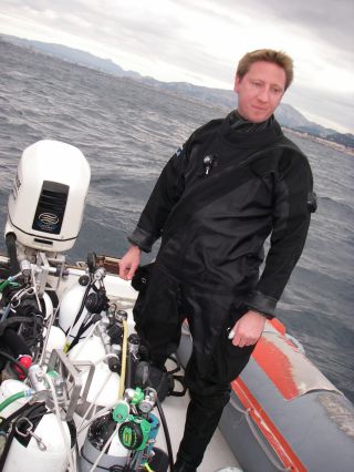 Nous avons rendez vous à Pointe Rouge. La mer est assez calme et les nuages encore loin, le soleil brille : la belle vie quoi ! Le zodiac est prêt, nous serons vite partis. L'épave apparait au sondeur : énorme, sur un fond de 52 mètres. Là, la météo change un peu, le ciel est de plus en plus gris au dessus de nos têtes. Bastien accompagnera Laure qui n'a plongée que sur l'arrière de la Drôme. Ils partent en tête alors que nous finissons de nous équiper. Alex respirera un Tx normo et moi de l'héliox, comme d'hab.... La descente est assez longue car le bout est un poil trop long... Nous croiserons nos deux plongeurs en arrivant sur la cassure car pour eux, c'est le moment de remontée: ils n'ont pas de déco et ont de l'air dans leur bloc. Visiblement ils ont froid dans leur combinaison humide..... l'eau est à 15°. En étanche c'est les Maldives !!!