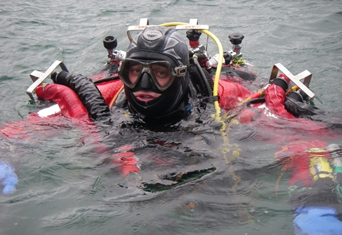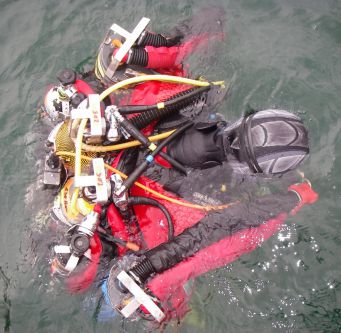 Nous nous mettons à l’eau à 10 heures 30, check à 6 mètres et c’est parti pour la descente. Longue, longue, très longue. Habituellement on descend à toute allure, aujourd’hui, c’est bien pépère. Je suis le premier et Bernard ne me double as comme une fusée, étrange… Arrivé à 105, l’épave apparaît mais la visi est loin d’être au top … je n’ai pas l’appareil (les pièces ne sont pas toutes arrivées) et je ne le regrette pas. Nous avançons au dessus de l’aile en direction du cockpit, je jette un œil à mes afficheurs, ils sont un peu haut, 1,45, mais le mano de diluant est sur 50 bars !!!! Panique !!! Je commence à rebrousser chemin quand je me dis que je vais de toute façon consommer environ 10 bars au fond et qu’à la remontée, mon diluant ne me servira pas. De nouveau je fais demi tour et me ballade un instant, jette un œil dans le cockpit et rejoint le boot pour la remontée, j’ai à peine attaqué la montée que mes deux acolytes sont en dessous. Il commence à faire froid quand je suis au palier de 60 mais je sais qu’à 36 mètres le réconfort m’attend… J’ai préparé une batterie de 12 volts au plomb gélifié. Le temps de la brancher et là, c’est le bonheur. Le gilet me procure chaleur et confort !!