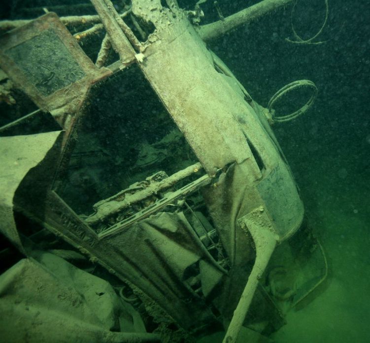 Le cockpit vu de dessus. On voit très nettement le manche à balai qui effleure de la vase, l'antenne Gonio (ronde) et le bras de renfort d'aile. L'intérieur de l'appareil contient les différents appareils de transmission radio.