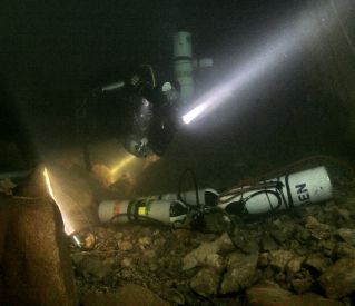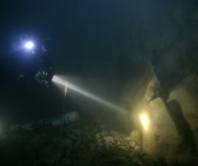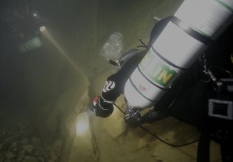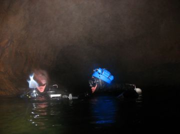 Nous déchargeons la voiture, et filons faire un premier voyage et voir la vasque. Elle est pleine, l'eau est claire mais le courant semble bien marqué... Nous n'avons pas l'intention de tirer du fil après le terminus de Xavier dans le S3 à 110 mètres (voir son article ici) mais de sortir la tête de l'eau après le S1 et d'aller voir le départ du S2, voire plus si c'est possible. Nous installons une corde pour pendre les blocs de chacun d'entre nous pour la déco final, soit deux 7 litres de Nx 70 et un S80 d'O2 en sécu, plus une batterie pour le frileux de la bande... Après quelques voyages et les différents préparatifs me voilà dans l'eau : je vais aller voir si l'étroiture d'entrée est aussi petite qu'au Durzon ou si ça passe tranquille... J'en profite pour installer les blocs à 14 mètres, voir si le fil est en place et si la visi est correct. Mes compères Philippe et Alex ne tardent pas à me rejoindre comme prévu. Ils sont tous deux équipés de bi 10 et d'un S80 de Nx 40, il ne faut pas trainer car la plongée du S1 se fait à 30 mètres de part en part., bon au recyclo c'est différent mais en ouvert, il faut regarder les aiguilles des manos un peu plus souvent...Dès que tout le monde est prêt, je passe devant et la descente commence. L'eau a travaillée la roche de la résurgence créant des sculptures tout à fait fantasmagoriques du plus bel effet. La galerie devient rapidement large et la visi correct de l'ordre de 4 mètres. Les méandres de cette rivières souterraines sont ludiques, parfois le fil part dans le noir et on a du mal a voir les parois. C'est large, sans doute très large... Mes deux suiveurs ont la banane !!! Une indication sur la câblette indique 110 mètres. Plus loin, au shunt nous prenons à droite à l'allée. Je reconnais certains endroits caractéristiques, je suis en effet déjà venu ici avec Marc puis plus tard Alix. Nous étions équipés de bi 10 et avions fait demi-tour rapidement car nous avions pris notre temps et appliqués la règle des quarts. Aujourd'hui le palmage est soutenu mais le courant ne nous facilite pas la tâche.... ça ira mieux au retour ! C'est vraiment super, ça tourne, ça monte un peu, ça redescend, la roche change de tons et de formes, on passe sur le fil, puis dessous, à côté main droite, puis main gauche au gré des contorsions de la galerie. Le fil remonte et sur un parterre de sable fin, des poissons jouent dans la lumière de mon phare. Je reconnais ablettes, chevaines, une tanche et un poisson chat !!!! Etonnant à quasi 300 mètres de l'entrée.... Le miroir apparait au dessus de ma tête mais 6 minutes de paliers m'empêchent de sortir. Je fais signe à Philippe d'aller voir. Alex resté en arrière me fait signe de sa lampe qu'il a un souci. En effet il est saucissonné dans le fil, par les pieds tout d'abords puis par le robinet de son S80. rapidement je le dégage et il va voir l'autre côté du miroir. Mes paliers terminés, je les rejoints. L'air est respirable mais doit contenir pas mal de gaz carbonique. Philippe fait quelques images.