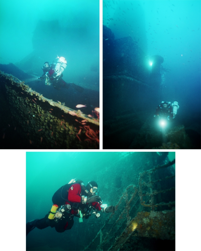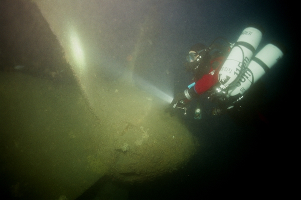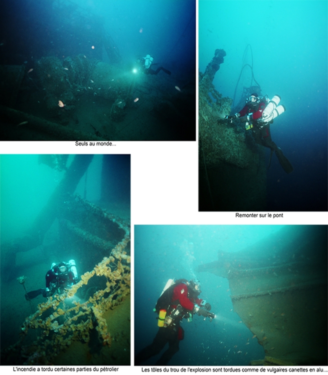 Nous sommes seuls au monde à l’arrière du pétrolier, Roland et son binôme Hubert ayant décidé de visiter l’intérieur du bateau. Les autres palanquées doivent être disséminées çà et là, l’épave est si grande… Les treuils, les tuyaux et les vannes sont proportionnelles à la taille du navire. Après avoir vu le gouvernail et l’hélice une nouvelle fois et refait quelques images nous rejoignons le trou béant de l’explosion. Les tôles froissées sont impressionnantes. Nous remontons sur l’avant du château : environ 23 mètres de haut, l’équivalent d’un immeuble de sept étages : gigantesque vu depuis le pont !!