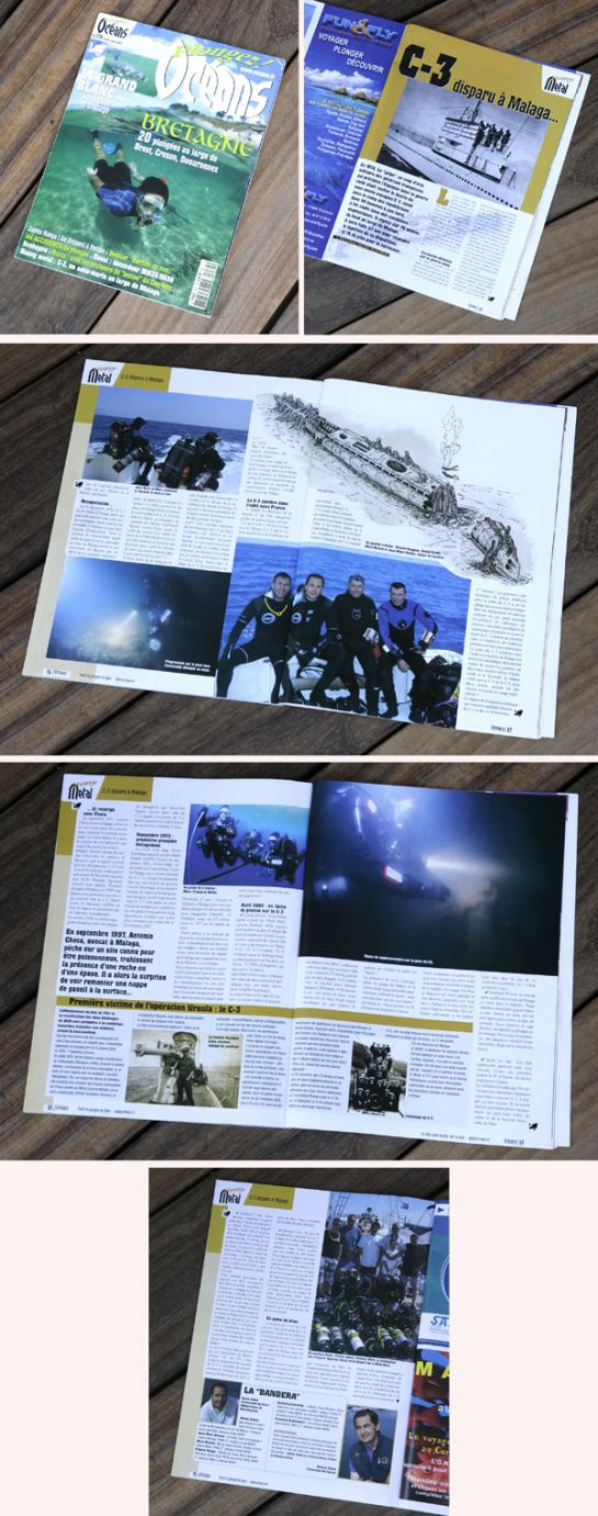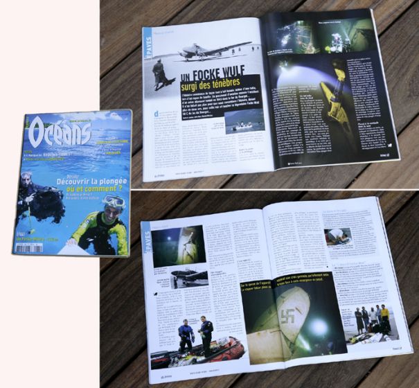 Dans notre petite communauté de plongeurs d'épaves profondes, les magazines spécialisés et notamment "Océans" sont la vitrine de notre activité et le lien entre les différentes équipes. Nous sommes très heureux quand les colonnes de ces magazines nous sont ouvertes. Ici le numéro 285 de mai/juin 2005.