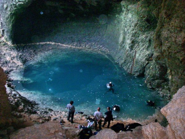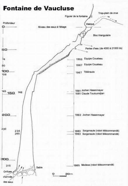 La revue Octopus a traité le sujet dans son numéro 11 de décembre janvier 1998 de lors de la plongée record de Pascal Bernabé à environ 250 mètres. Le site est touristique, l'eau est souvent d'une rare clarté et la vision de la vasque est comme une promesse, une invitation... seulement la plongée à Fontaine est soumise à autorisation et il n'est pas facile de touver le "Césame" qui permet de voir le monstre de plus près. La coupe de la cavité est assez impressionnante et ce type de profil porte le nom de résurgence Vauclusienne... Il y en a d'autres en France comme celle de Gourneyras dans l'Hérault, par exemple.