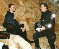 Après plusieurs dates repoussées, le week-end du 26/27 septembre est retenu. Malgré plusieurs désistements des prétendants, nous sommes quatre à nous donner rendez vous pour le grand jour. Nous établirons notre QG à L'Isle sur Sorgues par commodité. L'hôtel les Névons est très confortable et situé en centre ville. Son parking est fermé, le matériel en sécurité. Les suisses Eric et Michaël arriveront la veille après une plongée au Grand Goul de Bourg Saint-Andéol. Alex et moi le matin même. Nous pouvons accéder en voiture près du restaurant au bord de la rivière pour décharger notre matériel. Quatre voyages seront nécessaires pour amener le matos au bord de la vasque. Ce type de journée est rare car l'équipe du club local qui délivre les autorisations essaie de regrouper les demandes sur quelques jours dans l'année. Nous sommes donc une petite dizaine de plongeurs à en profiter. Les premières rotations commencent quand nous sommes quasiment prêts. Les prérogatives ont été annoncées : 50 mètres, une heure... Un peu sévère car nous espérions aller voir un peu plus bas mais c'est la première fois que nous somme là et c'est donc une prise de contact avec Roland et la résurgence. Nous partons bientôt Alex et moi après avoir fait nos contrôles de surface et à 6 mètres. Après avoir passé "l'étroiture" à 9 mètres, la salle s'élargit et dégringole rapidement jusqu'à une vingtaine de mètres. Là une marche nous fait basculer dans le vide. La descente commence dans le noir, identique à nos sensations lacustres. Soudain je pense, contrairement à nos habitudes, à regarder mon profondimètres. J'éclate de rire dans mon embout !!!! Alex se demande ce qu'il se passe et éclaire tout autour de nous à la recherche de quelques choses qui pourrait clocher ... Non, non, ce n'est pas là qu'il faut chercher mais bien à nos poignets.... nous sommes partis depuis moins de quatre minutes et nous sommes déjà à 50 mètres !!! La cavité est magnifique, énorme ! Nous regardons sous nos pieds, dans le vide. Cette salle est de plus en plus grande. L'eau est cristalline, nous sommes tous deux suspendus dans le vide, comme dans l'espace : c'est vraiment magique !!! Nous passons un peu de temps dans la zone des cinquante mètres puis attaquons notre lente remontée... quelques choses ne tournent pas rond contrairement à nos plongées habituelles : nos ordinateurs ne nous donnent pas de paliers...pourtant ils ont l'air de fonctionner. Nous visitons en détails la galerie qui remonte vers la lumière. Vers 20 mètres l'eau est chargée. Nous ferons un palier de confort à 6 mètres avant de sortir de l'eau au bout de 45 minutes d'immersion. Nous sommes les derniers sortis et les voyages des précédents plongeurs ont commencé pour ramener le matériel aux voitures. Il faut environ 45 minutes pour acheminer le matériel de la voiture à la vasque et autant pour le ramener. Il y a de quoi décourager les plus tenaces...