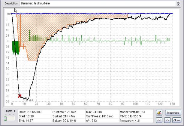 Mon profil (rallongé par rapport aux données du HS Explorer) de la seconde plongée sur la chadière.
