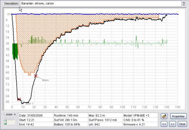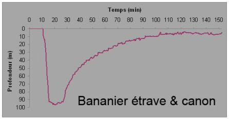 Mon profil (rallongé par rapport aux données du HS Explorer) de la première plongée sur l'étrave et le canon.